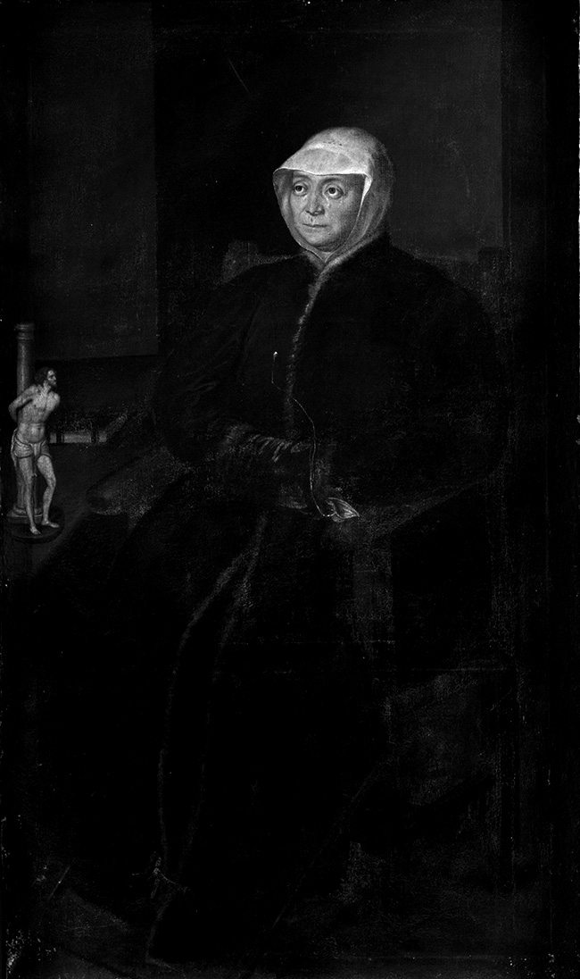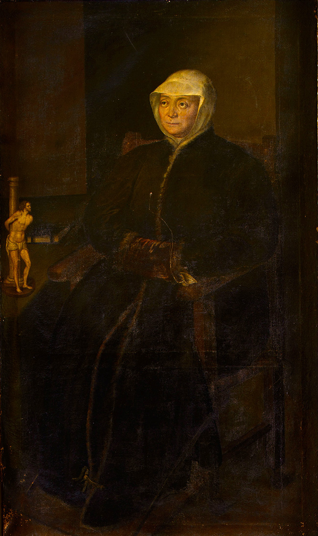 Dark tones of brown and dark shades of brown tending to black dominate throughout the handwork. The only chromatic contrasts, yellow-brown and yellow-white, are visible on the countess's face and on the body of Christ. The architectural wings can be glimpsed through the very slight nuances of the lightest brown tones.