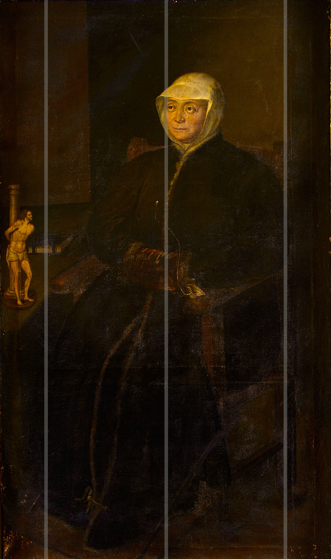 The vertical lines of the small column and the back architectural wings dominate; while the diagonal lines create a tension raising from the bottom upwards and are marked by the perspective inclination of the armchair. The countess's face is drawn to the right of the central symmetry line and is counterbalanced by the Christ slightly moved away from the edge. The most dynamic element is the body of Christ that is leaning forward.