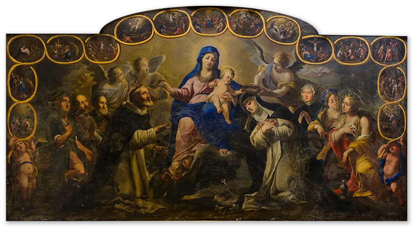 On the opposite sides of the painting, two chubby little angels are holding a frame with fifteen ovals showing the Mysteries of the Rosary. The weight of the composition is central and symmetrical, and all the lines and gazes converge towards Mary, strengthening her centrality. Moreover, an inner triangle encloses the Mother and her Child, while a larger triangle contains the two Saints.