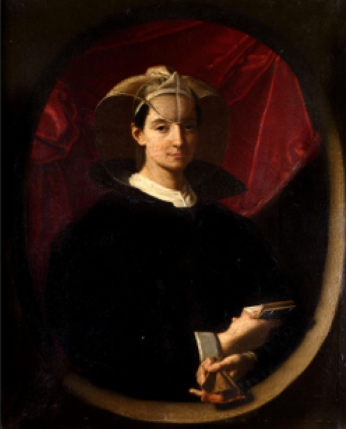 L’ambientazione è scarna, caratterizzata dalla semplice presenza di un drappeggio rosso alle spalle della donna e da un finto oculo dipinto che incornicia la figura, affinché l’attenzione dell’osservatore sia focalizzata su di lei, vero fulcro dell’opera. La simmetria centrale dona un equilibrio solido alla protagonista.